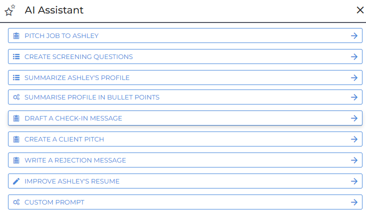 - From the AI Assistant slideout on a job, contact, or candidate record, you can select a prebuilt prompt or enter your own custom prompt.