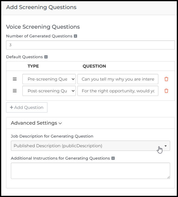 These are standard pre- and post-screening questions that will be added to every job record processed by the automation. This is useful for questions that should be asked across all roles, regardless of job specifics.