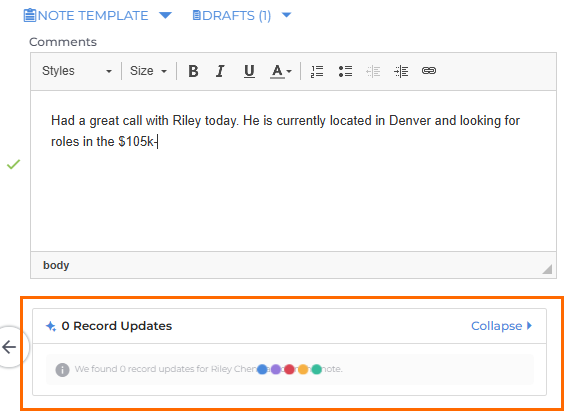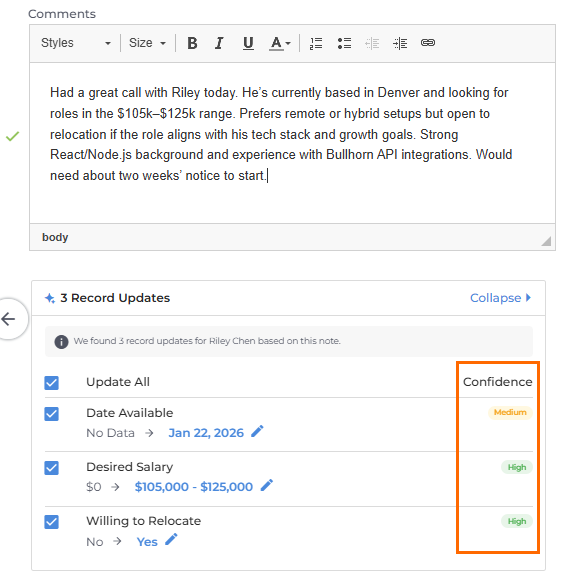This feature saves time by reducing manual updates and helps maintain data integrity by ensuring fields stay up to date whenever new information is added through a note. It’s especially useful for intake notes or call summaries where you record details such as desired salary, employment type, or start date.