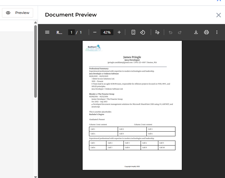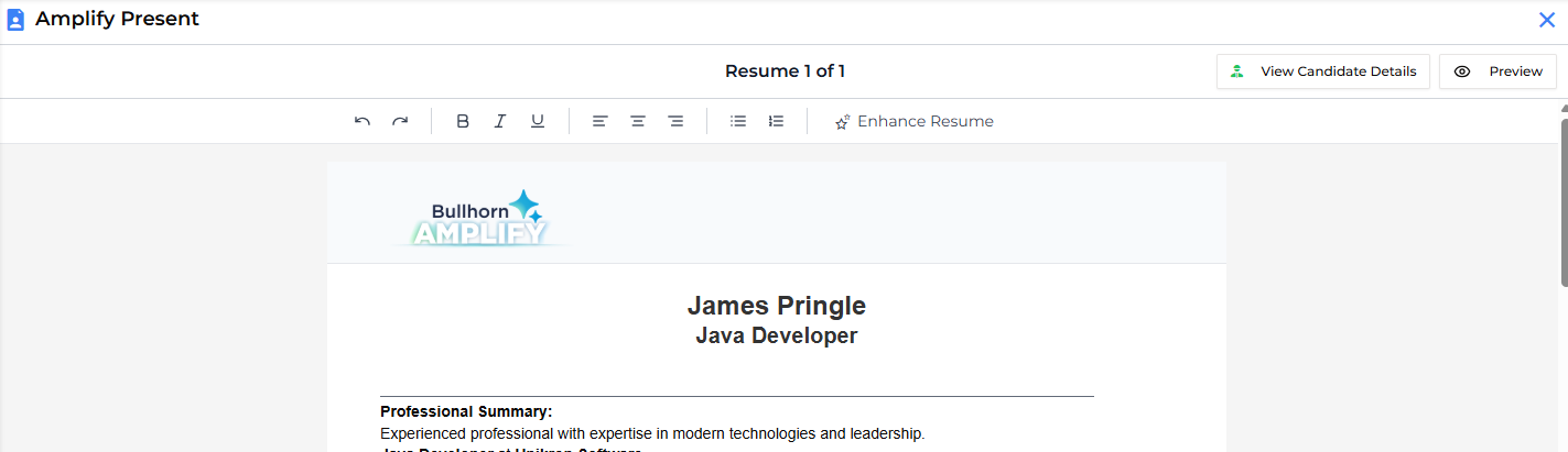 In this article, you’ll learn how to generate an Amplify Present document from a candidate record in Bullhorn ATS. When you generate a document, Amplify automatically fills your selected template with data from the candidate’s record, giving you a professional, tailored document in seconds.