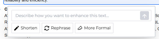 Highlight any section of text, then click Enhance to shorten, rephrase, or adjust the tone. You can also enter a custom request. Amplify will regenerate the selected content based on your selection.