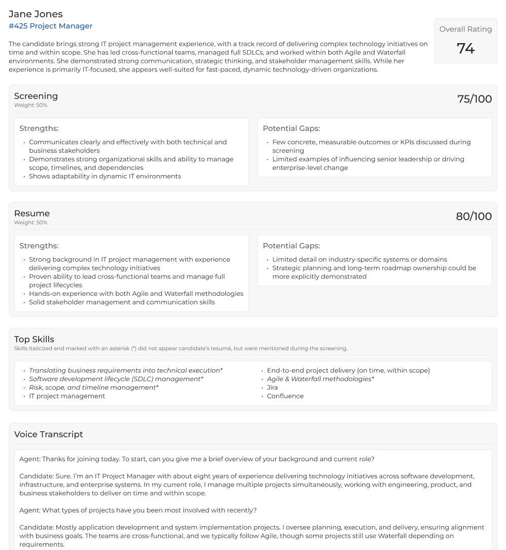 The new Screening Summary provides a clearer, more structured view of a candidate’s screening results, making it easier to quickly identify strengths, potential gaps, and top skills.