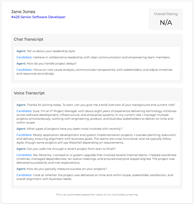 If the candidate starts a screening but does not complete it, a partial summary is generated that includes only the chat and/or voice transcript (if applicable).