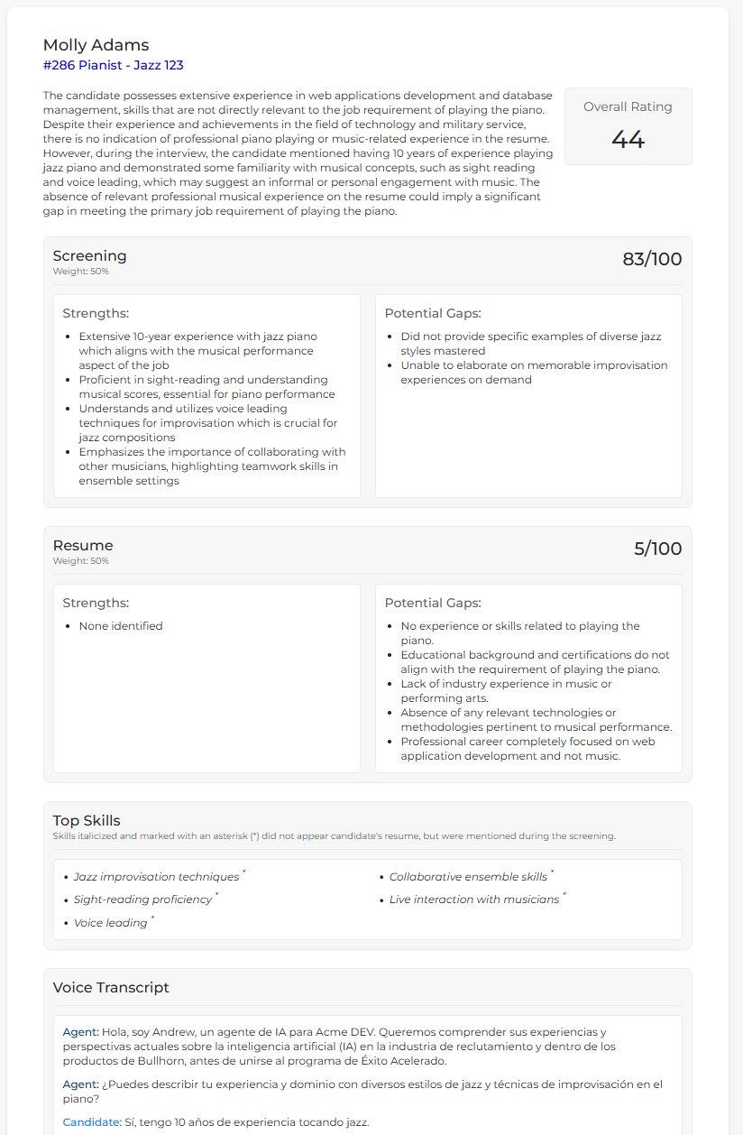 The example below shows how the summary displays a mismatch between screening performance and resume content. In this fictional example, the candidate demonstrated relevant strengths during the screening, but those strengths were not reflected in their resume.