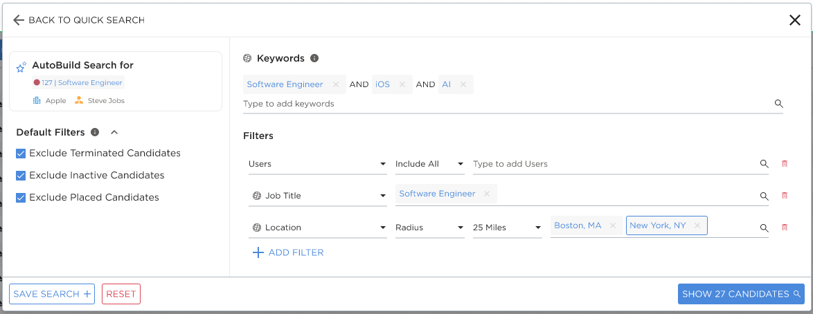 When you select a job record, Autobuild will create a candidate search based on the information stored on the job record. By default, this includes keywords relevant to the job description, a matching job title, and a location within 30 miles/kilometers (depending on your user preferences) of the job's location. You can refine the criteria and add/remove keywords before running the search.