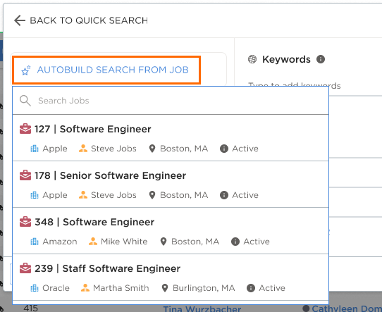 On the Candidate list, open the Quick Search and enter a keyword. From here, the system will search for relevant matching job titles in your ATS and will list them below for you to select from.