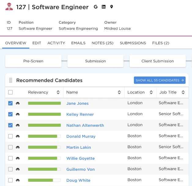 The Recommended Candidates card displays the top 20 most relevant candidates directly on the Job record overview. Similar to Autobuild, Bullhorn finds the most relevant candidates by building a tailored search in the background based on information found on the job record.