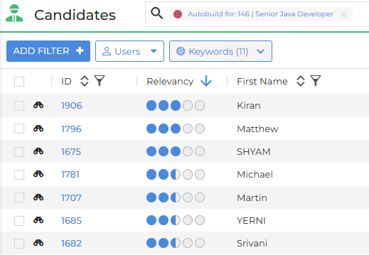 The Relevancy column displays a row of circles that fill in based on how strong the match is. More filled circles indicate a stronger match.