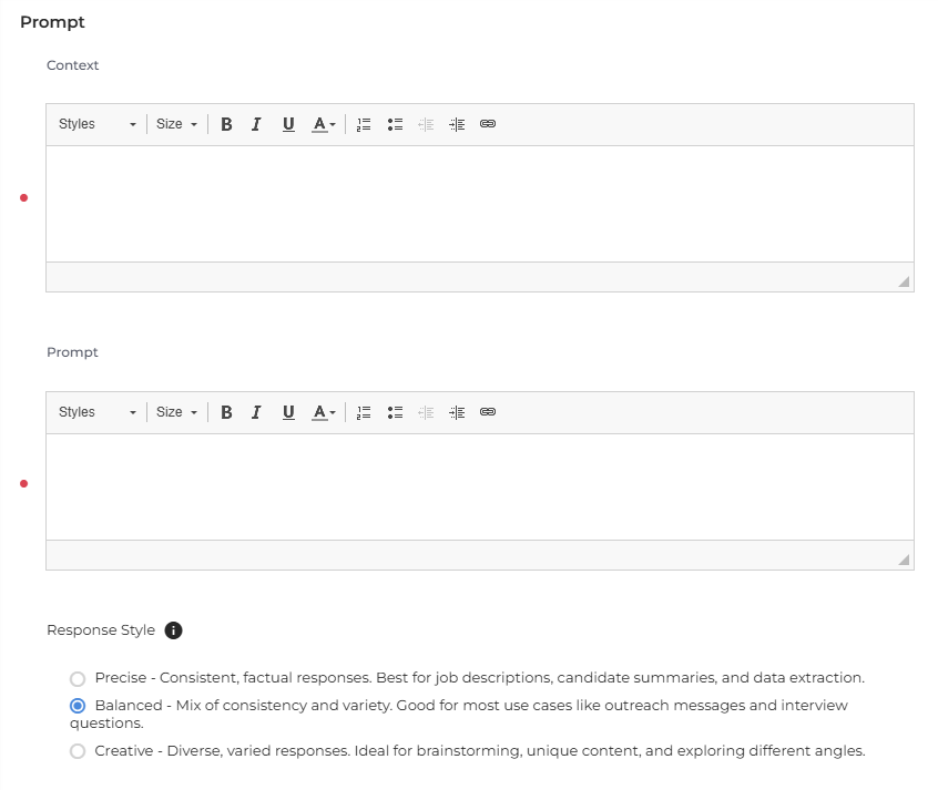 Precise: Consistent, factual responses. Best for job descriptions, candidate summaries, and data extraction.