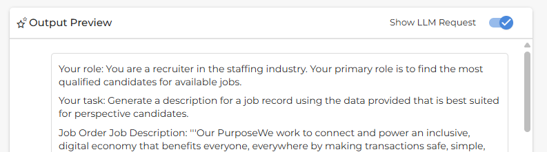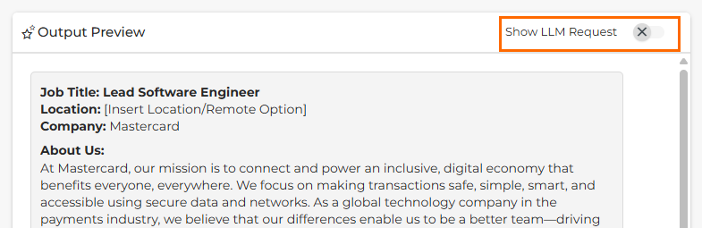 If you’d like to see the full details of what’s being sent to the LLM and the complete response it returns, toggle on Show LLM Request at the top of the output preview area.