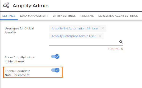 Candidate Notes Enrichment is turned off by default. An Admin user can enable it in Amplify Admin.
