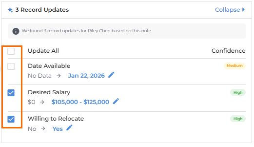 When you add a note to a candidate record, Amplify analyzes the text and suggests updates to relevant fields. You can: