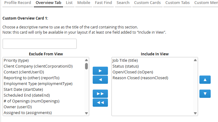 Use the arrow buttons to move desired fields to Include in View for each card.
