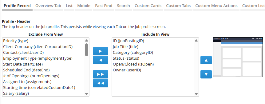 Under Profile - Header, use the arrow buttons to move desired fields to Include in View.