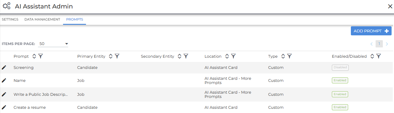 Under the Prompts tab, you'll find all available prompts, including Bullhorn defaults and any custom prompts your team has created.