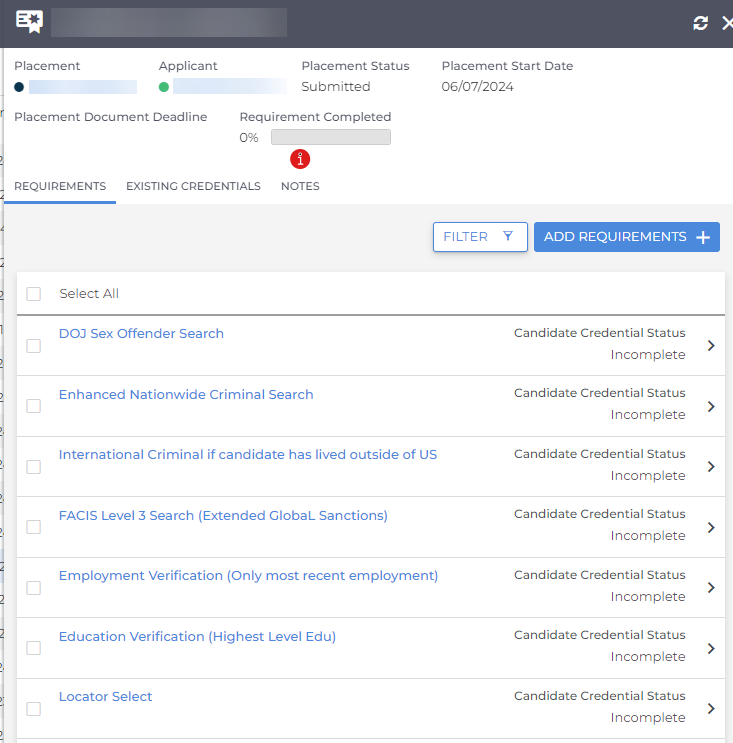 The Requirement Checklist is a comprehensive list of all the credentials and requirements that a candidate needs to meet for a specific placement. It helps you ensure that everything is in order before a candidate starts their role, keeping the process organized and compliant.