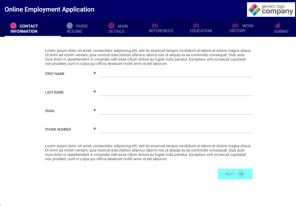 - Allows candidates to enter their basic information including any required sections or fields. Candidates can choose to parse their resume to pre-populate fields, or fill in completely manually.