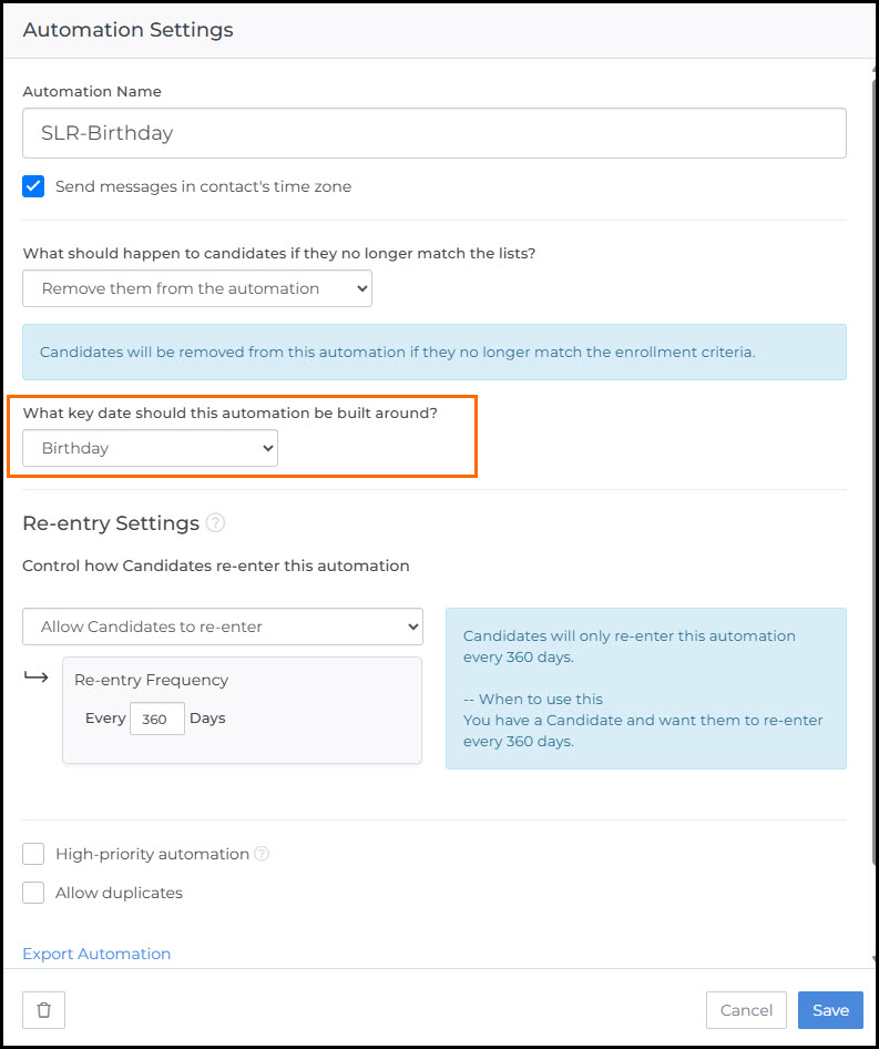 Your list criteria will determine which records should be used for this automation, and the date field you choose to center this automation around will determine if and when the records should enter the automation, along with which step they should enter at.