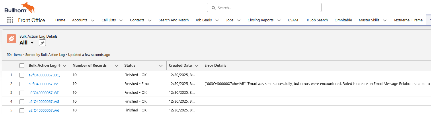 An action that is performed for a large volume of data (for example, an email sent after selecting a large number of Candidates) Log (TR1__BHHV_Bulk_Action