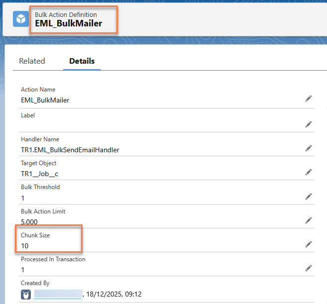 Generic/reusable component that can be added to pages to show a fully configurable/customizable list of records and actions.): Chunk Size field on the Bulk Action Definition record for EML_BulkMailer