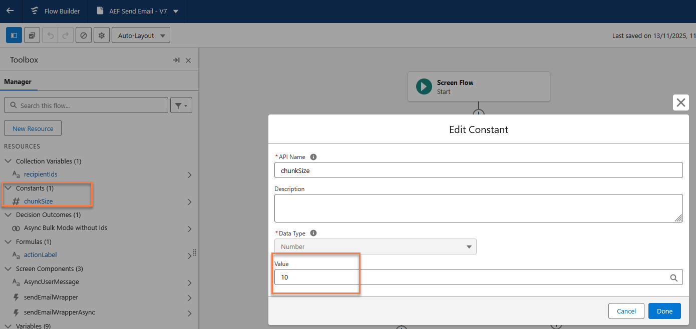 Async Flow Actions: ChunkSize constant in the AEF_Send_Email flow (Setup > Flows > AEF Send Email > Toolbox Manager > Constants > #chunkSize: you have to override the default value of 10)
