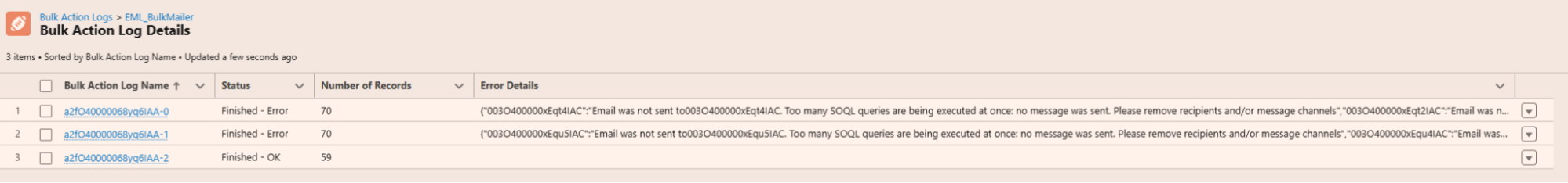 Next, each of those Bulk Action Log records is split into batches of 60. The first 3 Bulk Action Log records (500 recipients each) will contain 9 batches; 8 batches of 60, and a final batch of 20. ((8 x 60) + 20 = 500)