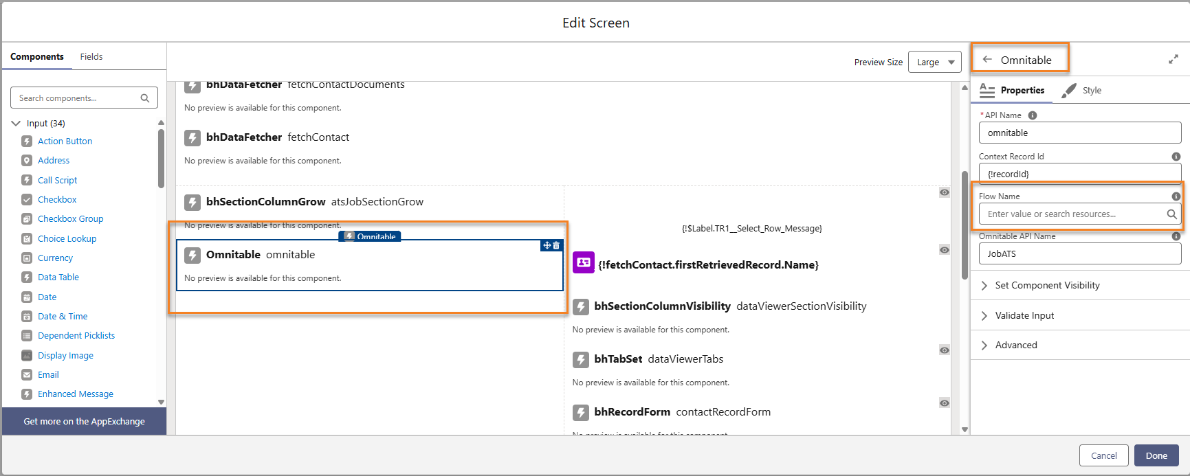 - Find the Omnitable component in the Flow and go to its Properties on the right-hand side.