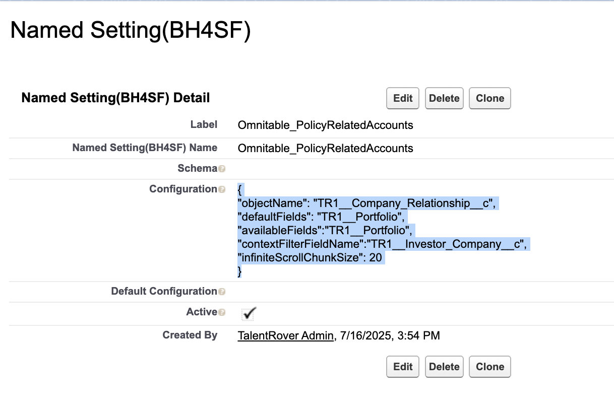 - Create a new config for omnitable in the Named_Setting__mdt custom metadata with the name 'Omnitable_PolicyRelatedAccounts', e.g.: