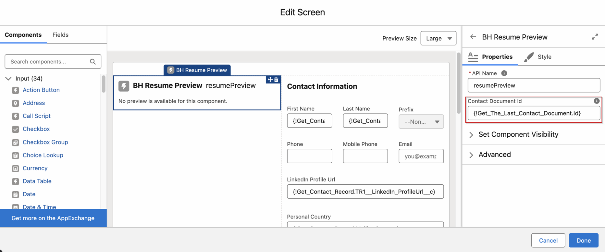 The new component accepts a Contact Document ID as an input variable and displays the associated resume or document file. This LWC component is designed for use in flow-based workflows, allowing administrators to build custom candidate data management processes that include document preview capabilities.