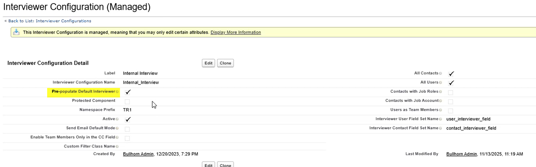 Check the Pre-populate Default Interviewer checkbox (This checkbox controls whether the Default Interviewer is pre-populated).