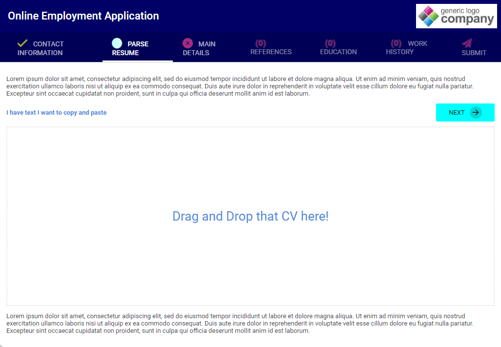 - Allows candidates to enter their basic information including any required sections or fields. Candidates can choose to parse their resume to pre-populate fields, or fill in completely manually.