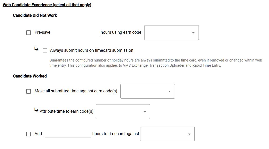- Candidate Did Not Work: Check Pre-save hours to have a specified number of hours pre-populatedand saved on an employee’s time card against a particular Earn Code. This means that once an employee signs into WTE and selects the week containing the holiday, they will already have the specified number of hours saved to their timesheet against the selected earn code.