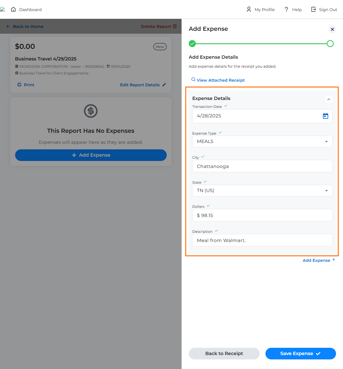 If you need to add another Expense to this receipt, select Add Expense. If you are done, click Save Expense.