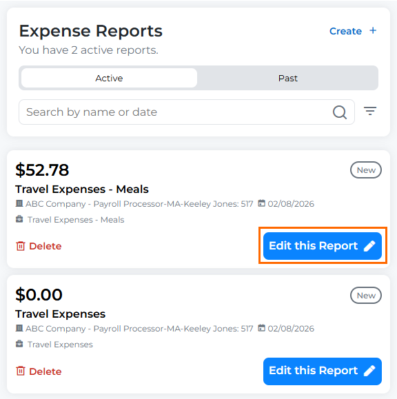 Locate the Expense Report you need to edit. You can do this by filtering by Active or Past Reports, searching for the Name or Date of the report, or using the scroll bar to look through all your reports.