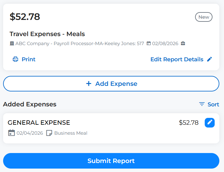 Submit Report: Use the Submit Report button to submit your expense report for approval. This button is available if your report was Saved, but not Submitted.