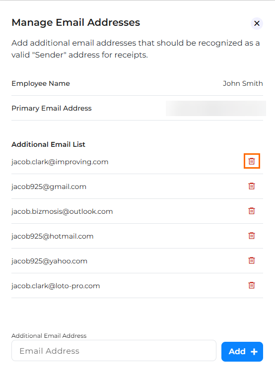 The Manage Email Addresses slide out will open. You can take the following actions: