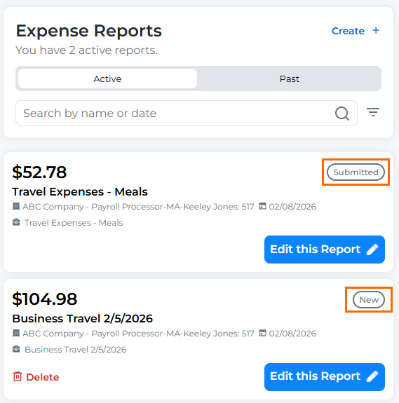 You'll now see a list of all your Active Expense Reports. Statuses are displaying next to each report amount. It’s possible to have any of the following statuses.