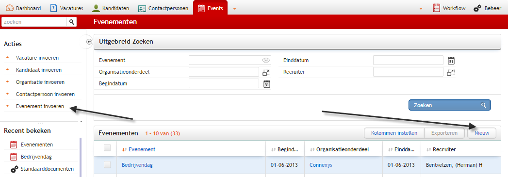 | Recruiter | Geeft aan welke recruiter verantwoordelijk is voor het evenement |