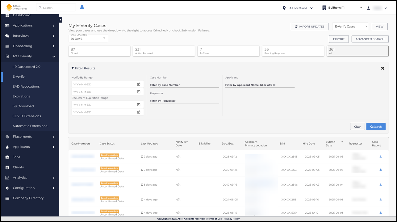 Users can now filter I-9 records by Actions Required, such as Closed, Action Required, To Close, and Pending Response, to quickly locate cases that need attention. A new advanced search option for Document Expiration Range makes it easier to identify records requiring updates due to expiring work authorization. Additionally, cases that are Closed with an Employment Authorized result now display in green instead of yellow, creating a clearer visual distinction for fully resolved cases.