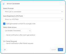 The “Enrich Candidate” step can now be used in candidate-type submission-based automations. This enhancement enables AI-driven enrichment directly within submission workflows to generate contextual insights such as match scores, skills gap analysis, and personalized job pitches. Results can be saved to candidate fields or added as notes referencing the associated job.