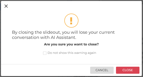 A warning will now display when you close an AI Assistant conversation or click Start Over. There is a checkbox allowing you to hide the warning going forward.