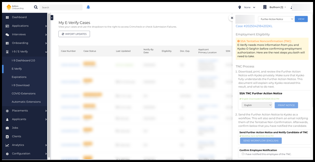 • Recruiters can now send a TNC workflow directly from the E-Verify details panel, allowing candidates to review their Further Action Notice and decide whether to take action on their case.