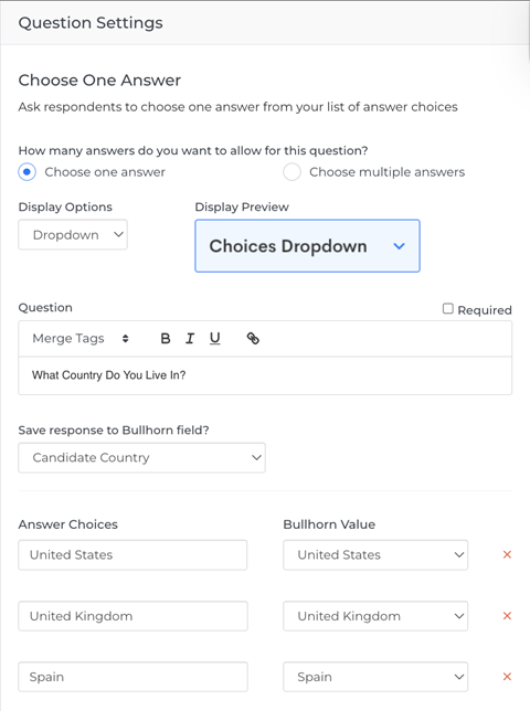 We recommend configuring this field for the Choose One Answer question types as a Dropdown to restrict responses to a single selection from the applicant. Each answer should then be set up as an individual Country, as shown in the example below: