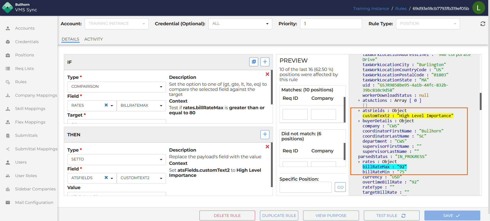 's Rules engine allows administrators to apply client-specific business logic to positions during the sync process. Rules are structured as If/Then statements and run after company, skill, and flex mappings have been applied. Rules can be assigned either account wide or at the credential level, and each rule is assigned a priority number that determines the order in which rules are applied.